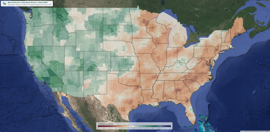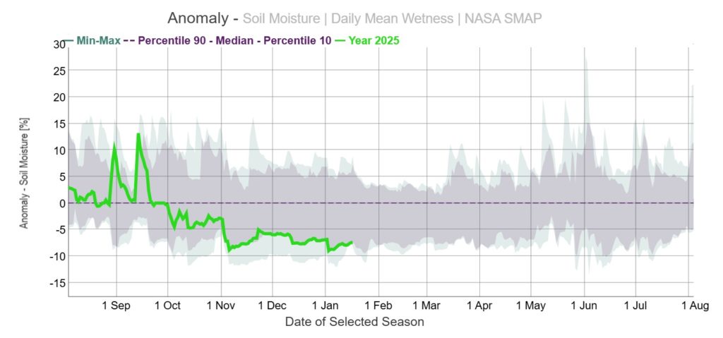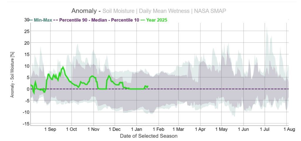 Winter wheat planting for the 2026 harvest year is now complete (Figure 7). TERRA ClimateExplorer soil moisture data (Figure 8) indicates generally favorable establishment conditions across the core winter wheat region of Southwestern Kansas. The outlook for winter wheat in this region is positive, as soil moisture has remained above historical average from December through January, substantially reducing the risk of crop failure for the 2025/2026 growing season (Figure 9).
