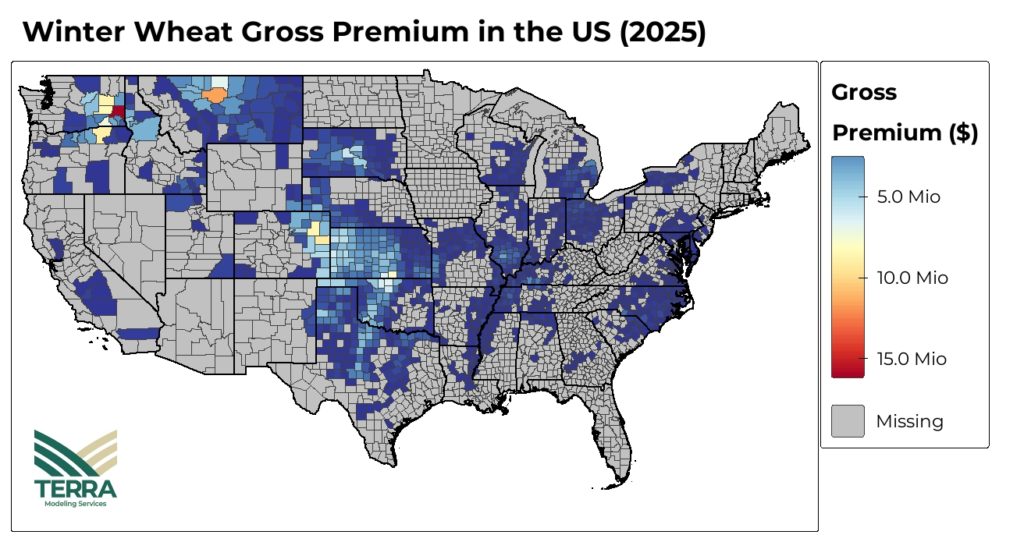 The majority of winter wheat production in the U.S., along with the associated insurance gross premiums, is concentrated in the Great Plains region. This geographic concentration creates specific risk exposure patterns that are critical for insurance portfolio management (Figure 2).